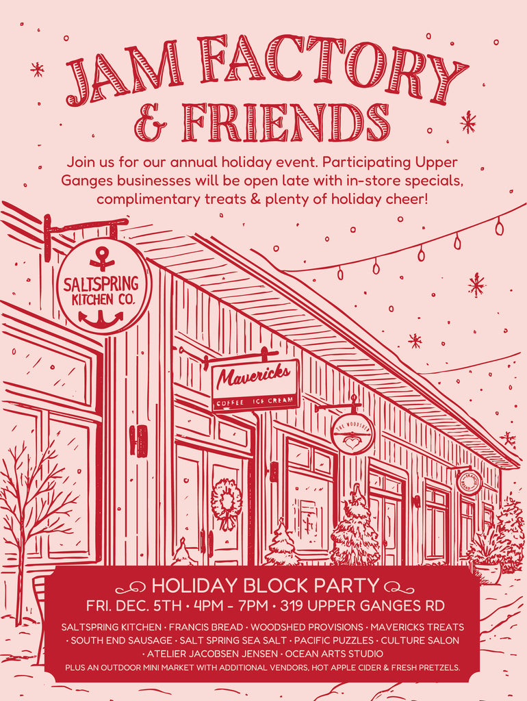Salt Spring Island is full of creative businesses, and Winter is when support matters most. Visiting The Jam Factory keeps bakers baking, chefs cooking, and makers making. It keeps staff working and shelves full. It helps small businesses stay steady in a quieter season.